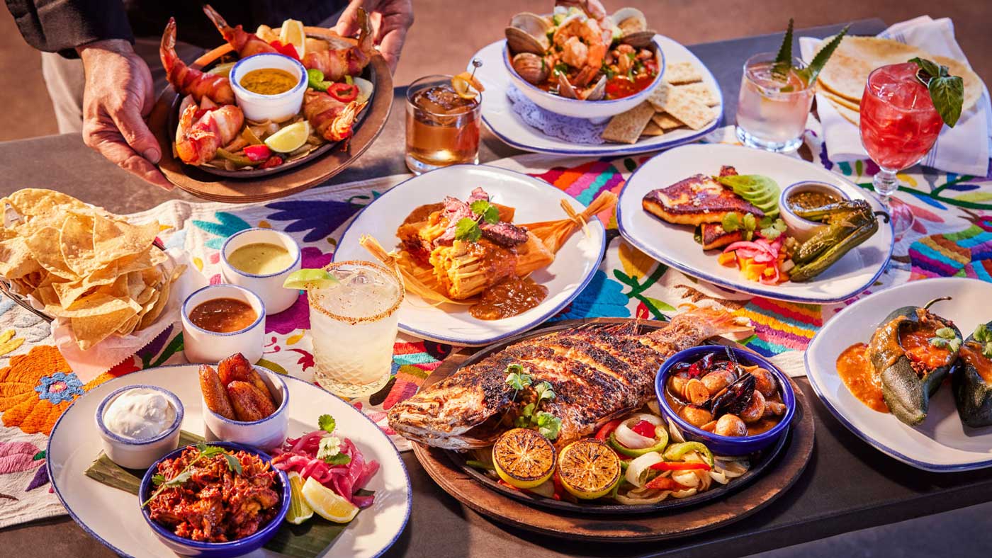 Beef and Chicken Fajitas, Shrimp a la Playa, Costillas de Res, Nopalito Salad, Rellenitos and Smoked Sausage